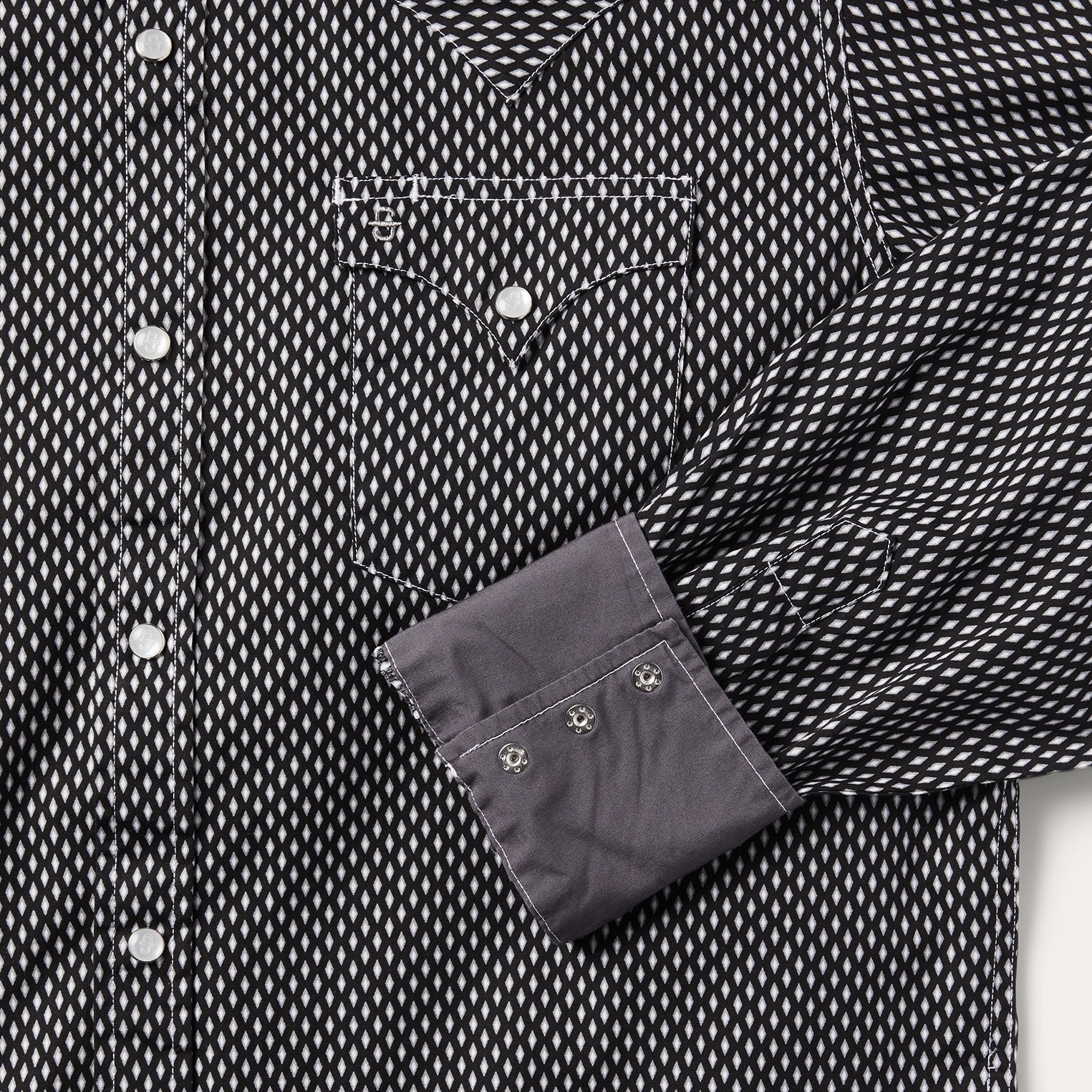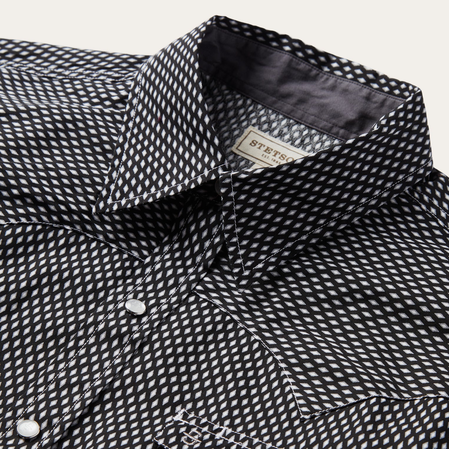 This Western shirt is crafted from crisp 100% cotton poplin and features a bold geometric Black Diamond print. The classic snap-front style has a two-point back yoke, two front pockets with one-point curved pocket flaps and three-snap cuffs. Additional details include pearl logo snaps. contrasting trim, the Stetson "S" embossed on the front left pocket, and STETSON embossed on the right sleeve placket. Cut trim, for a modern fit.