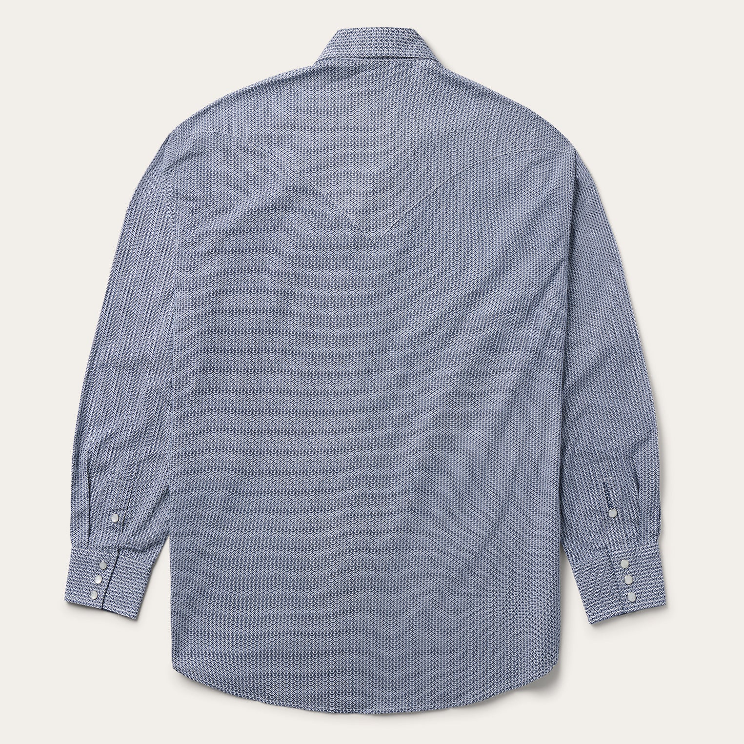 This Western shirt is crafted from a lightweight cotton poplin with a Blue Deco Geo allover print. It features a one-point curved back yoke, snap front featuring logo pearl snaps, and three snap cuffs. The front left pocket is adorned with the Stetson "S" logo and the right sleeve placket is embossed with "STETSON". It has a denim inside trim and is crafted with 100% cotton for quality, breathability and a feel that will only get better with age.