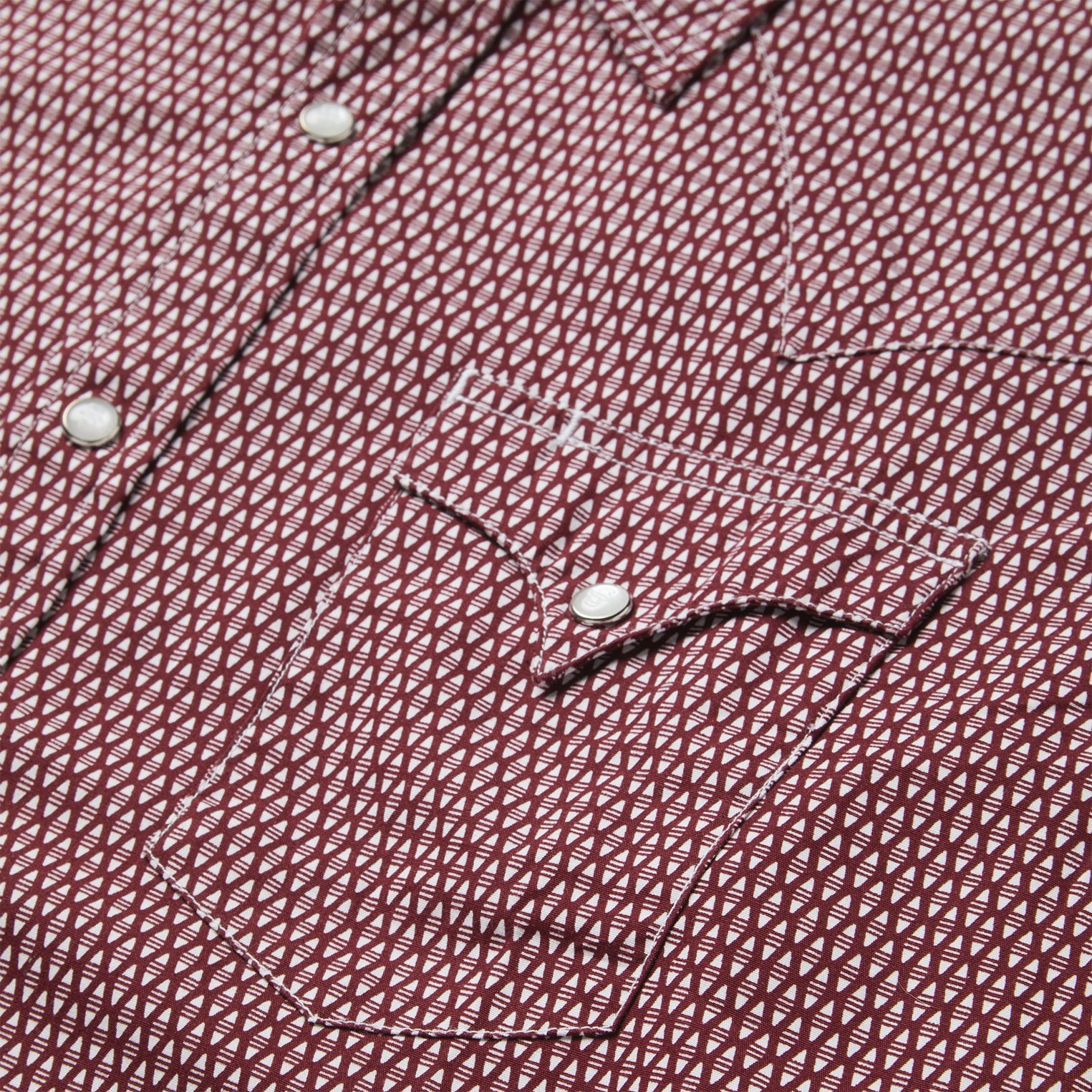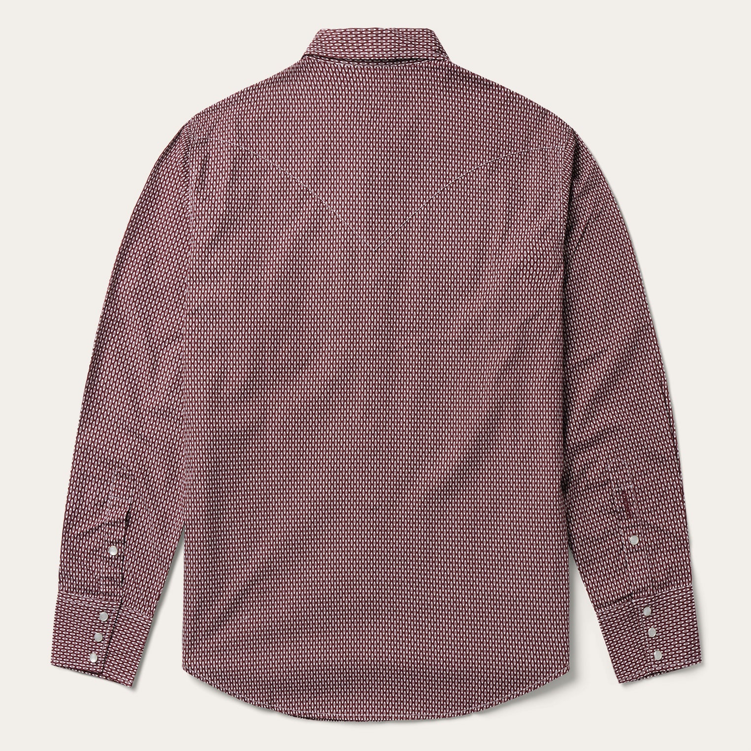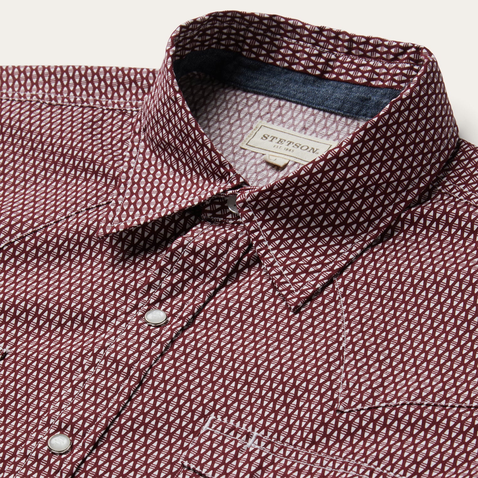 This Western shirt is crafted from a lightweight cotton poplin with an allover Broken Diamond print. It features a one-point curved back yoke, snap front featuring logo pearl snaps, and three snap cuffs. The front left pocket is adorned with the Stetson "S" logo and the right sleeve placket is embossed with "STETSON". It has a denim inside trim and is garment washed for a soft feel that only gets better with age. Cut trim for a modern fit and crafted with 100% cotton for quality and breathability.
