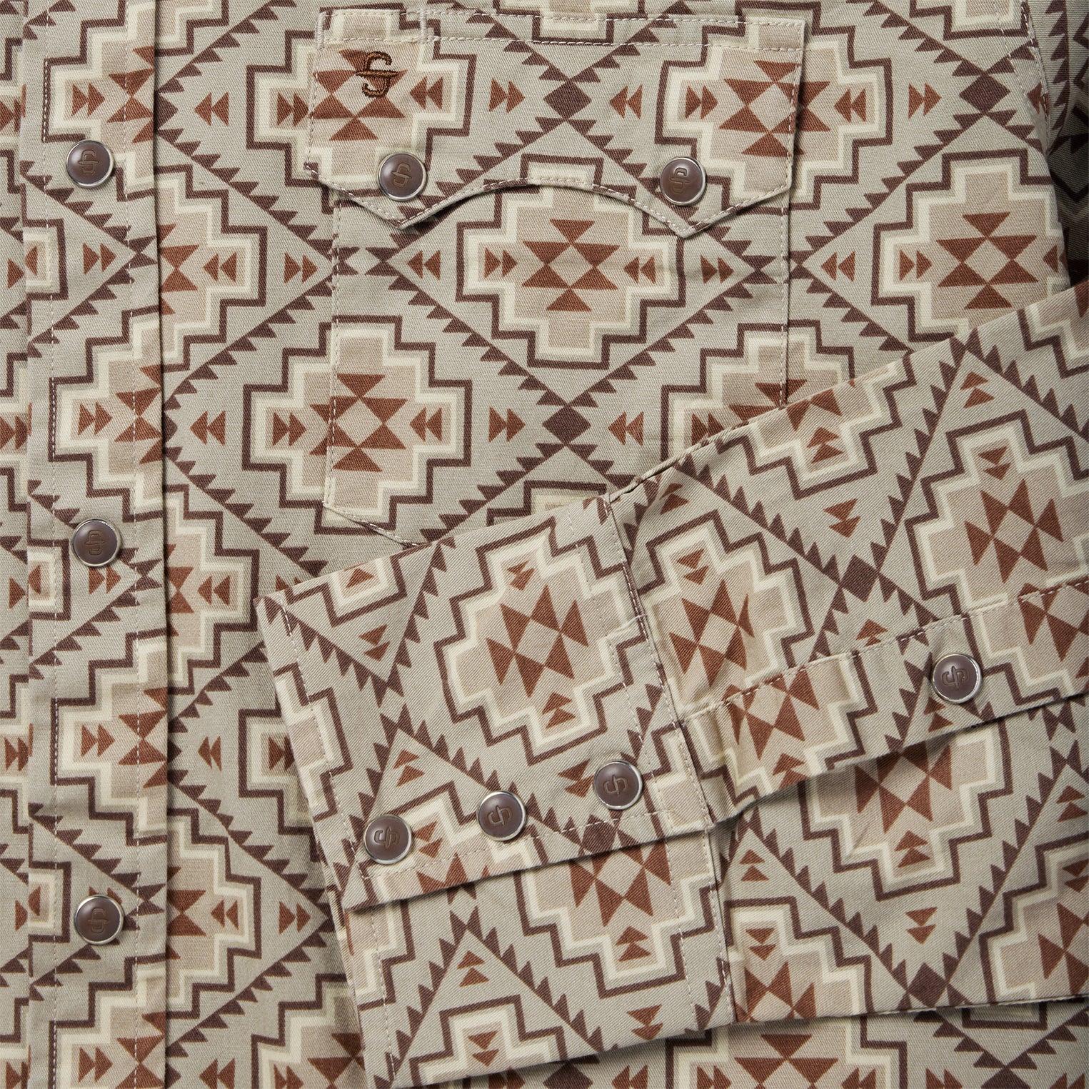 We set the standard for snap fronts. They’re not just Western-inspired, they’re imbued with a Western spirit. This modern fit shirt is crafted from crisp, breathable 100% cotton poplin that has been yarn-dyed for rich, lasting color and made to get better with age and wear. Featuring our exclusive all-over brown aztec print, it has a two-point curved back yoke, two-point curved pocket flaps, twill tape inside trim, subtle “S” and “Stetson” embroidery at the chest and right sleeve placket, a three-snap cuff and a classic snap front featuring opaque logo snaps.