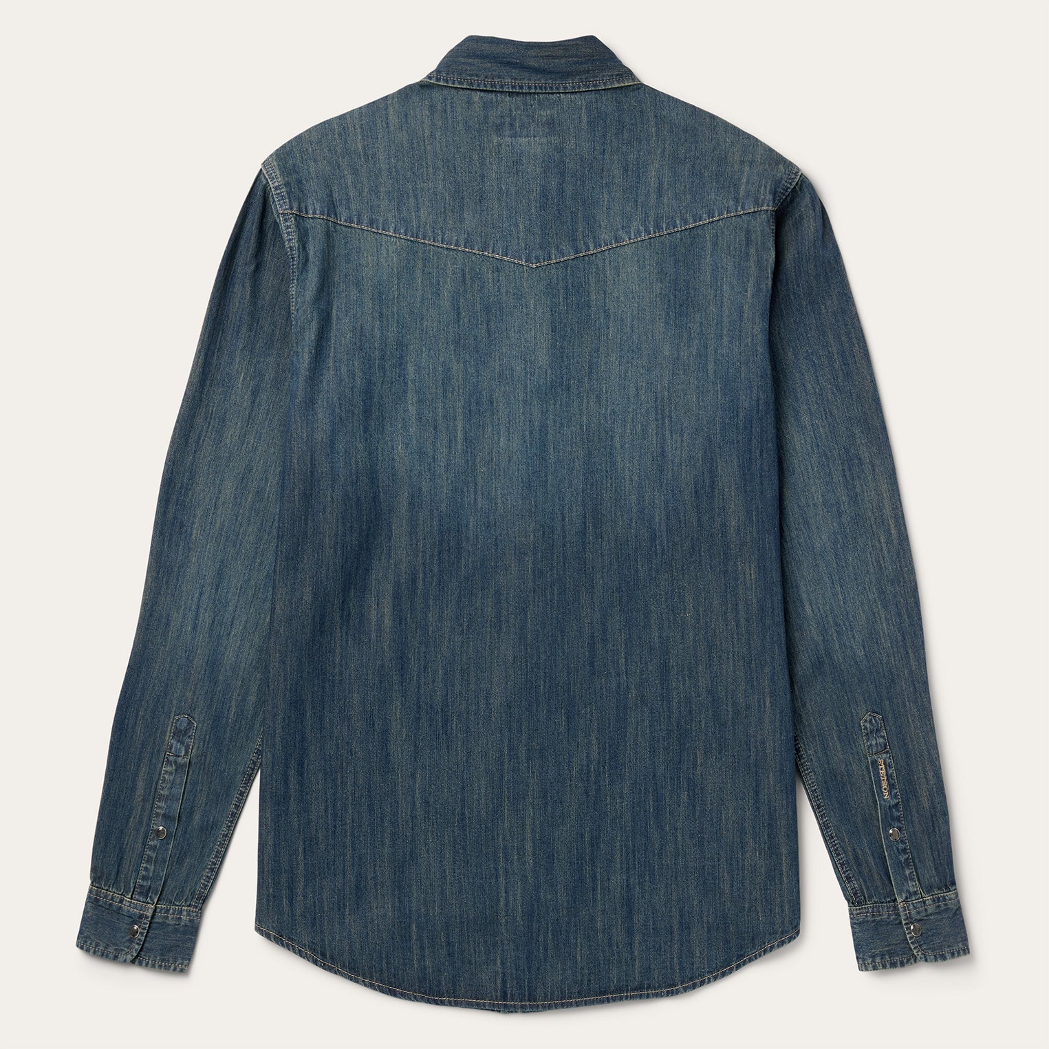 This snap-front western shirt is crafted from 100% cotton denim with a stylish “dirty” blue fade that’s made to get softer and more comfortable with time. Lightly hand-sanded for a lived-in appearance, it features a unique design with one open chest pocket, no front yoke, a one point back yoke and one snap cuff. Cut trim for a modern fit, the shirt is finished with navy-toned variegated pearl snaps and subtle Stetson embroidery that speaks to our commitment to quality. Hard-wearing and built to last, our denim shirts are defined by their rugged, practical, timeless style.