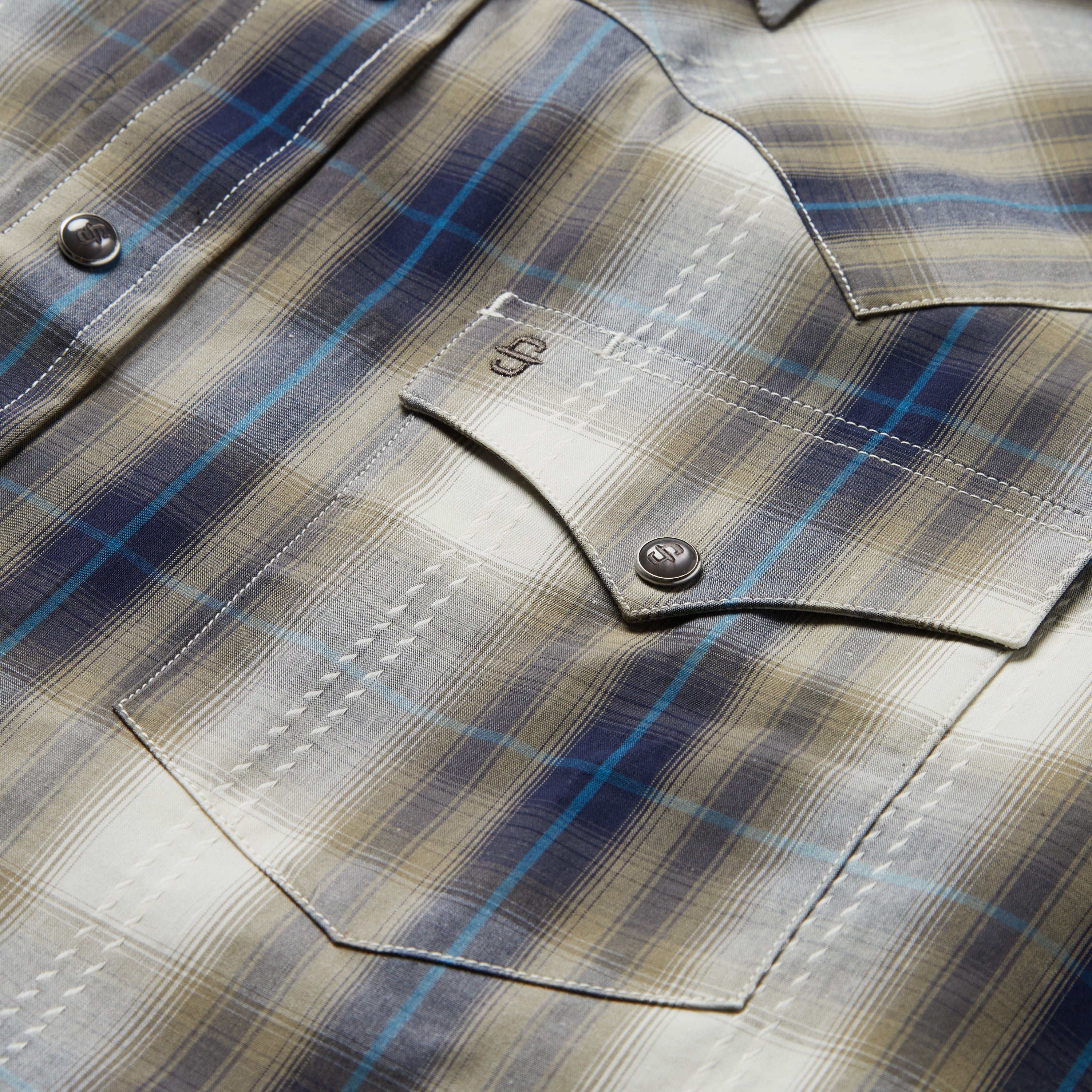 This snap front western shirt is crafted from 100% cotton and features a yarn-dyed ranch plaid with dobby stitch. It has two snap-closure pockets, a spread collar, contrast inside trim and a one point curved ultra deep back yoke.